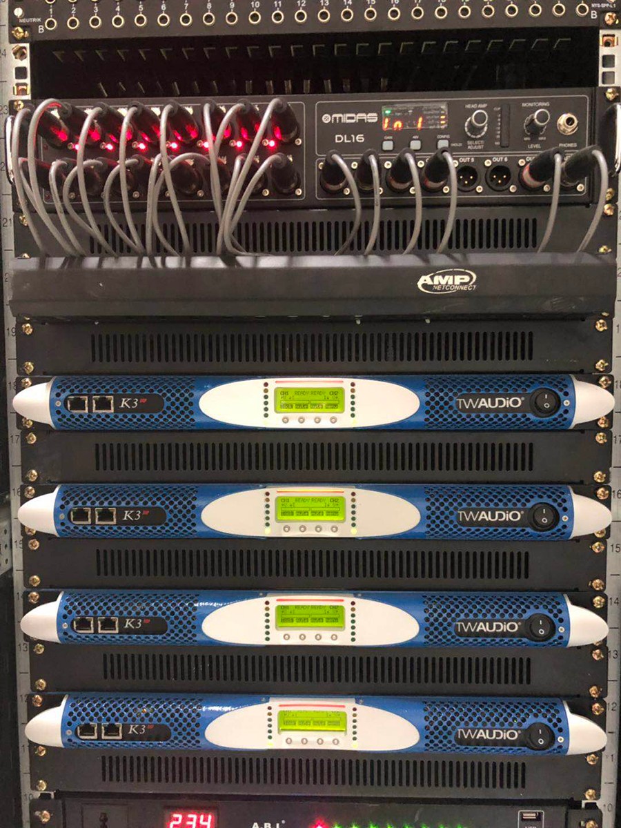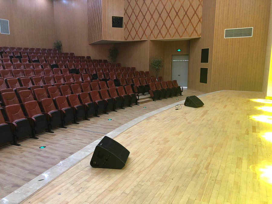 電子科技大學實驗中學劇場主擴聲系統采用6只90°的T20點聲源線陣列揚聲器打造,2只為一組分別吊掛在舞臺兩側和舞臺中央作為主擴聲,2只M12全頻音箱搭配2只B30超低放置在舞臺兩側作為前補聲以及低音補充,除此之外還有C12作為舞臺監聽。整套系統由4臺K3DSP數字功放驅動。監控室內采用英國Midas M32數字調音臺以及DL16舞臺接口箱。